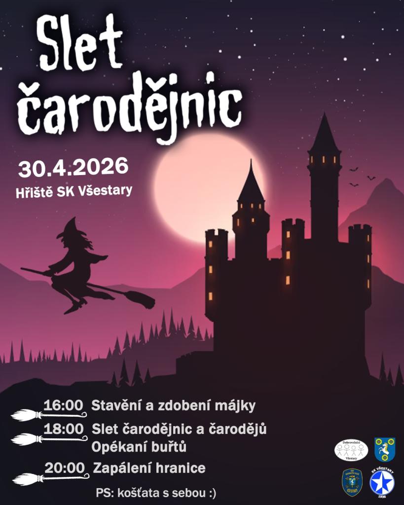Přijďte oslavit tradici čarodějnic na hřiště SK Všestary. Akce začíná ve 16:00 stavěním a zdobením májky, následovaným v 18:00 sletem čarodějnic a čarodějů. K dispozici bude opékání buřtů a večer ve 20:00 dojde k zapálení hranice.